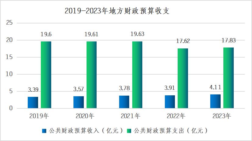 财政收入稳定增长。2023年,全县完成地方一般公共预算收入4.11亿元,同比增长5.1%。其中:税收收入2.07亿元,同比下降20.9%;非税收收入2.05亿元,同比下降57.0%。完成地方一般公共预算支出17.83亿元,同比下降1.2%。地方一般公共预算收入仅为地方一般公共预算支出的11.6%,财政自给率低,收支矛盾依然突出。