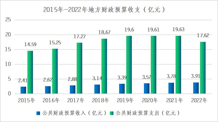 财政收入稳定增长。2022年,全县完成地方一般公共预算收入3.91亿元,同增长3.5%。其中:税收收入2.61亿元,同比增长7.3%;非税收收入1.30亿元,同比下降3.5%。完成地方一般公共预算支出17.62亿元,同比下降10.3%。地方一般公共预算收入仅为地方一般公共预算支出的22.2%,财政自给率低,收支矛盾依然突出。