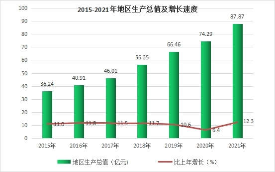 2021年,全部工业企业实现工业增加值17.27亿元,按可比价计算比上年增长19.1%(下同)。分门类看:采矿业增加值0.48亿元,增长-17.8%;制造业增加值10.50亿元,增长33.0%;电力、热力、燃气及水生产和供应业增加值6.29亿元,增长5.8%。其中,规上工业企业实现工业增加16.5亿元,同比增长22.5%。