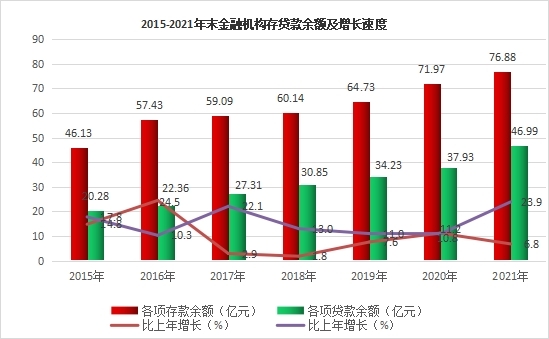 金融市场运行平稳。2021年,年末全部金融机构各项存款余额76.88亿元,比年初增加4.92亿元,增长6.8%;其中住户存款余额60.44亿元,比年初增加11.7亿元,增长11.74%,占全部金融机构各项存款余额的78.6%。全部金融机构各项贷款余额46.99亿元,比年初增加9.06亿元,增长23.9%。在全部金融机构各项贷款余额中:住户贷款余额21.95亿元,比年初增加2.37亿元,增长12.19%,占全部金融机构各项贷款余额的46.7%;非金融企业及机关团体贷款25.04亿元,比年初增加6.68亿元,增长36.4%,占全部金融机构各项贷款余额的53.3%。