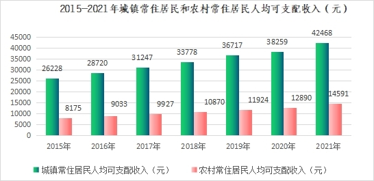 城镇常住居民人均可支配收入42468元,比上年增加4209元,增长11%,其中:工资性收入32300元,比上年增加1594元,增长5.2%;经营净收入7316元,比上年增加735元,增长11.2%;财产净收入536元,比上年增加247元,增长85.7%;转移净收入2316元,比上年增加1633元,增长239.1%;城镇常住居民人均消费支出26912元,比上年增加3117元,增长13.1%。