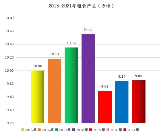 粮食再获丰收。全年粮食产量9.85万吨,比上年增加0.01万吨,增产0.1%。