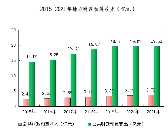 财政收入稳定增长。2021年,全县完成地方一般公共预算收入3.78亿元,同增长6.1%。其中:税收收入2.43亿元,同比增长7.6%;非税收收入1.35亿元,同比增长3.5%。完成地方一般公共预算支出19.63亿元,同比增长0.1%。地方一般公共预算收入仅为地方一般公共预算支出的19.3%,财政自给率低,收支矛盾依然突出。