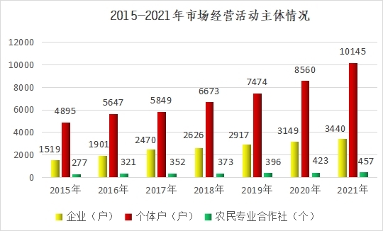 市场主体持续增加。2021年全县市场主体登记注册增加2428户,年末各类市场主体登记注册达到14042户。