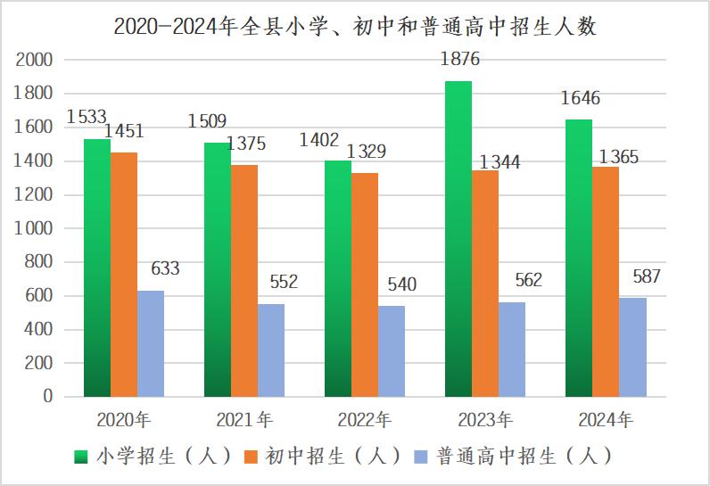 2024年末,全县拥有各类学校134所,教职员工2213人,比上年减少191人;专任教师1612人,比上年减少110人。其中:拥有高中1所,教职员工159人,专任教师141人,招生587人,在校学生1511人,毕业生491人;初中7所,教职员工444人,专任教师358人,招生1365人,在校学生4077人,毕业生1374人;中等职业技术学校1所,教职员工46人,专任教师35人,招生105人,在校学生210人,毕业生37人;小学58所,包括完全小学54所,教学点4个,教职员工886人,专任教师740人,招生1646人,在校学生9520人,毕业生1504人;幼儿园67所,包括公办60所,民办7所,拥有教职员工678人,其中专任教师338人,招收幼儿1450人;在校幼儿4458人,毕业幼儿2020人。