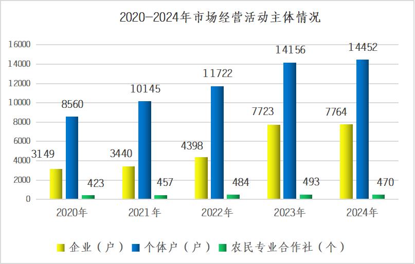 市场主体持续增加。2024年全县市场主体登记注册增加314户,年末各类市场主体登记注册达到22686户。
