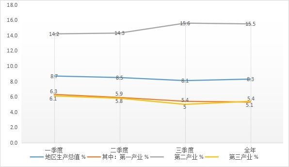 根据省州地区生产总值统一核算反馈结果,姚安县2022年实现地区生产总值为100.67亿元,按可比价计算同比增长8.3%,增幅高于全国(3%)全省(4.3%)全州(6.7%)水平。从三次产业发展来看:第一产业实现增加值28.97亿元,增长5.3%,对姚安县经济增长的贡献率为19.5%,拉动姚安经济增长1.62个百分点;第二产业实现增加值34.81亿元,增长15.8%,对姚安县经济增长的贡献率为55.8%,拉动姚安经济增长4.63个百分点;第三产业实现增加值36.89亿元,增长5.1%,对姚安县经济增长的贡献率为24.7%,拉动姚安经济增长2.05个百分点;三次产业结构由2021年的30.7:30.2:39.1调整到2022年的28.8:34.6:36.6,姚安县县域经济发展实现“经济总量超百亿元和结构由“三一二”到“三二一”的两大历史性突破,经济运行持续平稳向好。其主要特点如下: