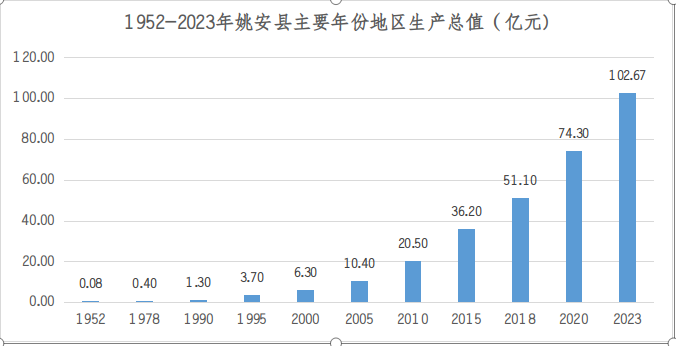 1952年,姚安县经济总量(GDP)仅826万元;1987年突破亿元大关,达到1.16亿元;2005年突破10亿元大关;2022年跨越100亿大关,达到100.67亿元;2023年全年实现生产总值102.67亿元,比1952年的826万元扩大了1461倍,年均增长10.0%。其中,第一产业实现增加值30.8亿元;第二产业实现增加值34.49亿元;第三产业实现增加值37.4亿元。人均地区生产总值从1952年的73元增加到2023年的64130元扩大了878倍。