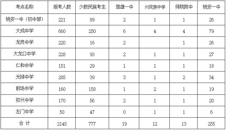 注:楚雄一中、师院附中、姚安一中的定向择优生按各学校报考人数乘以相应的定向择优招生比例(定向择优招生比例=定向择优生数∕总报考人数×100%;其中楚雄一中为0.85%,师院附中为0.6%,姚安一中为 11.9%)分配;州民族中学的定向择优生按各学校的少数民族考生数乘以民中定向择优招生比例1.5%(民中定向择优招生比例=民中定向择优生数∕少数民族考生总数×100%)分配。分配时原则上按照大入小舍,名额不足时由其余学校按分值从高到低补入。
