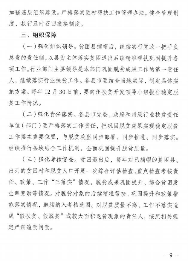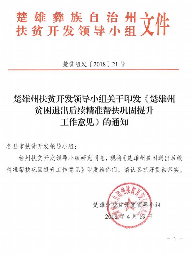 现将《楚雄州扶贫开发领导小组关于印发< 楚雄州贫困退出后续精准帮扶巩固提升工作意见>的通知》(楚贫组发〔2018〕21号)转发给你们,并落实好以下要求。