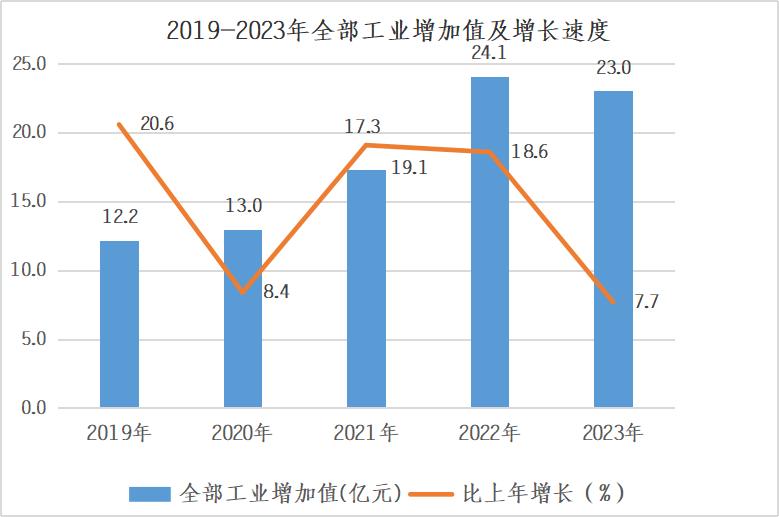 2023年,全部工业企业实现工业增加值23.04亿元,按可比价计算比上年增长7.7%(下同)。分门类看:采矿业增加值0.16亿元,下降43.4%;制造业增加值4.61亿元,增长20.8%;电力、热力、燃气及水生产和供应业增加值4.27亿元,下降7.5%。其中,规上工业企业实现工业增加21.5亿元,同比增长8.8%。