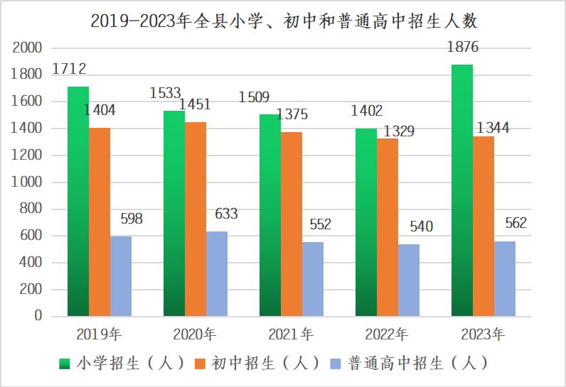 2023年末,全县拥有各类学校162所,教职员工2404人,比上年减少118人;专任教师1722人,比上年减少88人。其中:拥有高中1所,教职员工186人,专任教师129人,招生562人,在校学生1531人,毕业生595人;初中9所,教职员工482人,专任教师393人,招生1344人,在校学生4049人,毕业生1475人;中等职业技术学校2所,教职员工57人,专任教师43人,招生53人,在校学生148人,毕业生35人;小学72所,包括完全小学59所,教学点13个,教职员工926人,专任教师788人,招生1876人,在校学生9442人,毕业生1446人;幼儿园78所,包括公办69所,民办9所,拥有教职员工753人,其中专任教师369人,招收幼儿2175人;在校幼儿5275人,毕业幼儿2036人。