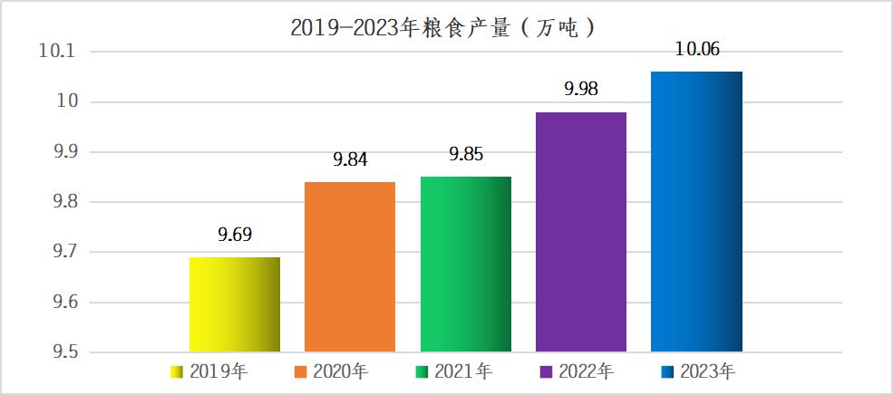 在总产量中,夏粮产量2.34万吨,比上年减少73吨,下降0.3%;秋粮产量7.73万吨,比上年增加878吨,增长1.2%。其中,稻谷产量2.92万吨,比上年增加500吨,增产1.8%;小麦产量0.61万吨,比上年减少883吨,减产12.6%;玉米产量4.59万吨,比上年增加5200吨,增产1.2%;豆类产量1.48万吨,比上年增加770吨,增产5.5%。