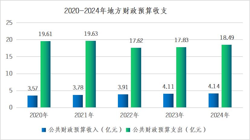 财政收入稳定增长。2024年,全县完成地方一般公共预算收入4.14亿元,同比增长0.6%。其中:税收收入1.74亿元,同比下降15.8%;非税收收入2.40亿元,同比增长17.2%。完成地方一般公共预算支出18.49亿元,同比增长3.7%。地方一般公共预算收入仅为地方一般公共预算支出的22.4%,财政自给率低,收支矛盾依然突出。