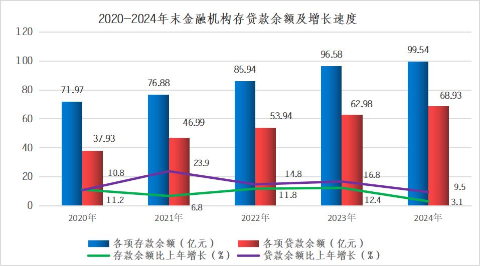 金融市场运行平稳。2024年,年末全部金融机构各项存款余额99.54亿元,比年初增加2.96亿元,增长3.1%;全部金融机构各项贷款余额68.93亿元,比年初增加5.95亿元,增长9.5%。