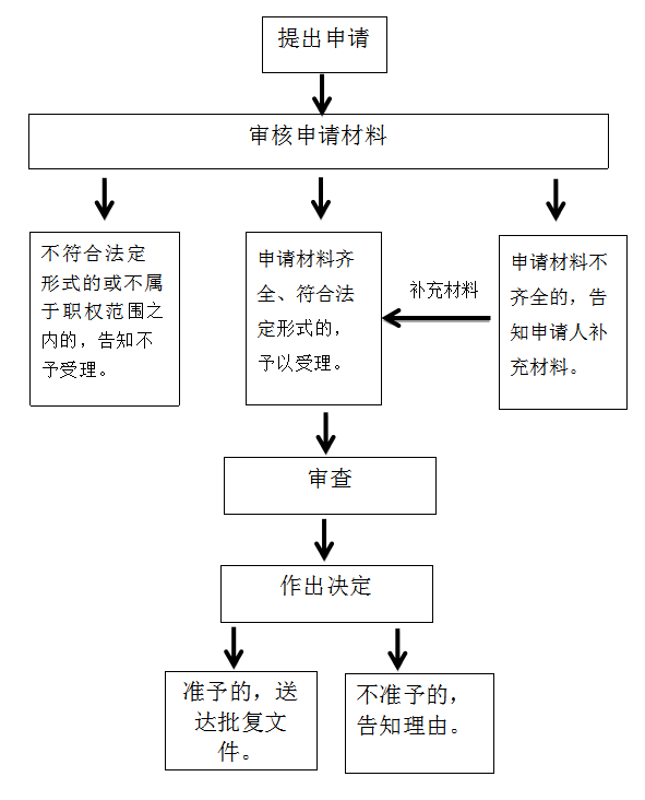 受理 | 3 | 现场受理申请材料的,受理人对照申请材料目录要求进行审核,申请事项属于本事项受理范围,申请材料齐全、符合法定形式,予以受理申请;申请材料不齐全或者不符合法定形式的 ,—次告知申请人需要补正的全部内容,申请人按照要求提交全部补正申请材料的,予以受理申请。 | 1、申请事项属于本单位职责范围,申请材料齐全符合规定形式,或者申请人按照本单位的要求提交全部补正申请材料的,予以受理 ; 2、申请事项属于本单位职责范围,但申请材料不齐全或者不符合规定形式的 ,— 次性告知申请人需要补正的全部内容; 3、申请事项不属于本单位职责范围的,不予受理。 |