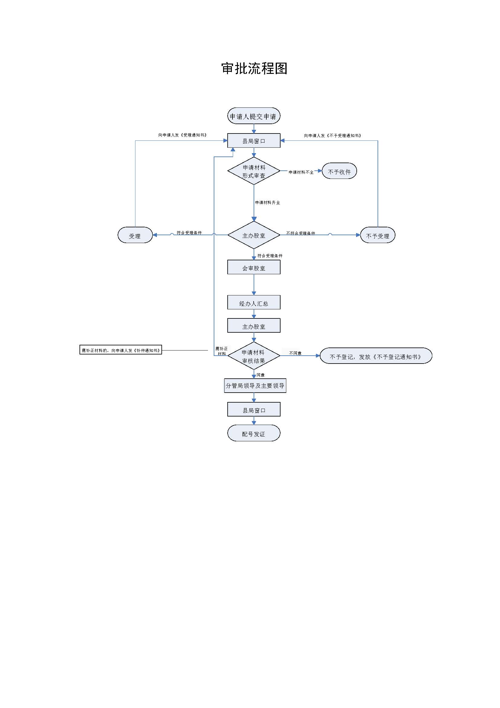 许可办理流程:申请、受理、审查、决定、证件制作与送达、决定公开。