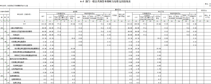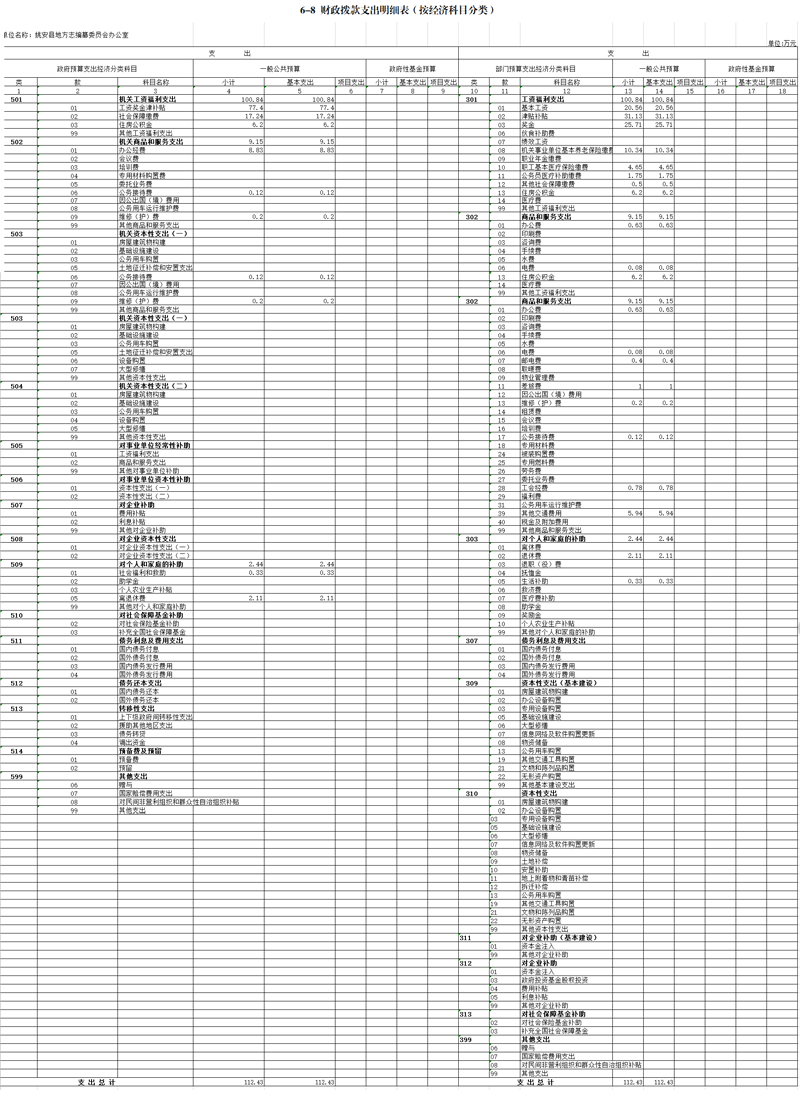经济科目分组(其中:基本支出112.43万元,项目支出0万元)。其中列“301”工资福利支出100.84万元,包含在职职工工资、医保、社保等福利性支出;列“302”商品和服务支出9.15万元,包含办公费、电费、邮电费、差旅费、会议费、培训费、公务接待费等支出;列“303”对个人和家庭的补助支出2.11万元。