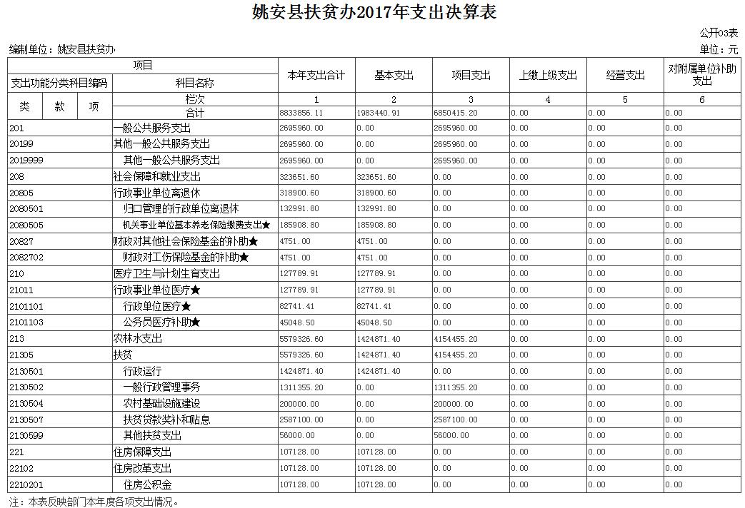姚安县扶贫办2017年度支出合计8833856.11元。其中:基本支出1983440.91元,占总支出的22.45%;项目支出6850415.2元,占总支出的77.55%;上缴上级支出、经营支出、对附属单位补助支出共0元,占总支出的0%。与上年对比同期减少23132100.00元。主要原因分析:主要是因为扶贫项目多数属跨年度实施的项目,多数项目已在上年度启动实施,所以本年度的项目资金支出相对减少。