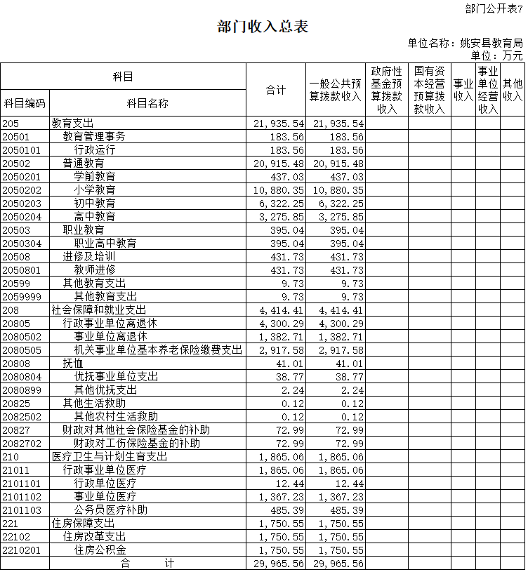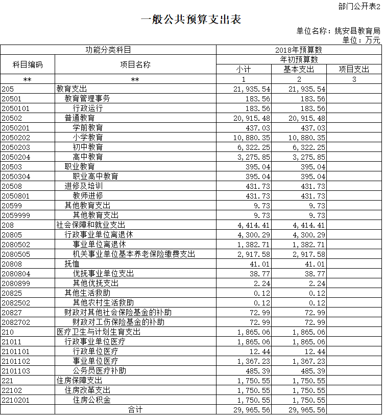 姚安县教育局2018年财政拨款预算总收入29965.56万元,其中:本级财力29965.56万元。2018年财政拨款预算总支出29965.56万元。按支出功能科目分类,支出列“ 205类01款01项”预算支出183.56万元,主要反映教育局机关人员、办公支出;“ 205类02款01项”预算支出437.03万元,主要反映县幼儿园人员、办公支出;“ 205类02款02项”预算支出10880.35万元,主要反映全县小学教育人员、办公支出;“ 205类02款03项”预算支出6322.25万元,主要反映全县初中教育人员、办公支出;“ 205类02款04项”预算支出3275.85万元,主要反映姚安一中人员、办公支出;“ 205类03款04项”预算支出395.04万元,主要反映姚安县职业高级中学人员、办公支出;“ 205类08款01项”预算支出431.73万元,主要反映姚安县教师进修学校人员、办公支出;“ 205类99款99项”预算支出9.73万元,主要反映人员、办公支出;“ 208类05款02项”预算支出1382.71万元,主要反映离退休人员改革性补贴支出;“ 208类05款05项”预算支出2917.58万元,主要反映机关事业单位养老保险支出;“ 208类08款04项”预算支出38.77万元,主要反映中小学校临时人员经费支出;“ 208类08款99项”预算支出2.24万元,主要反映中小学校临时人员经费支出;“ 208类25款02项”预算支出0.12万元,主要反映弥兴中心学校李桂兰医疗补助经费支出;“ 208类27款02项”预算支出72.99万元,主要反映中小学校教职工工伤保险基金支出;“ 210类11款01项”预算支出12.44万元,主要反映机关单位医疗保险经费支出;“ 210类11款02项”预算支出1367.23万元,主要反映事业单位医疗保险经费支出;“ 210类11款03项”预算支出485.39万元,主要反映机关事业公务员医疗补助支出;“ 221类02款01项”预算支出1750.55万元,主要反映机关单位住房公积金经费支出。