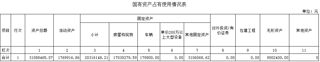截至2018年12月31日,本部门资产总额31,088,465.07元,其中,流动资产1,769,916.86元,固定资产20,316,148.21元,对外投资及有价证券0元,在建工程0元,无形资产9,002,400.00元,其他资产0元(具体内容详见附表)。与上年相比,本年资产总额减少1343911.34元,其中固定资产增加698457.48元。