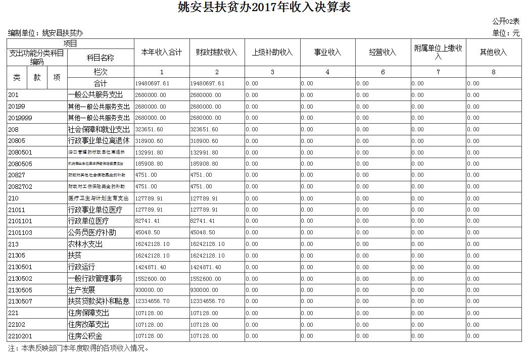 姚安县扶贫办2017年度收入合计30587997.61元。其中:财政拨款收入19480697.61元,占总收入的63.69%;上级补助收入0元,占总收入的0%;事业收入0元,占总收入的0%;经营收入0元,占总收入的0%;附属单位缴款收入0元,占总收入的0%;其他收入0元,占总收入的0%,年初结转和结余11107300.00元,占总收入的36.31%;与上年对比同期减少12485300.00元,减少28.99%。主要原因分析:主要是因为扶贫项目多数属跨年度实施的项目,多数项目已在上年度启动实施,所以本年度的项目资金预算收入相对减少。