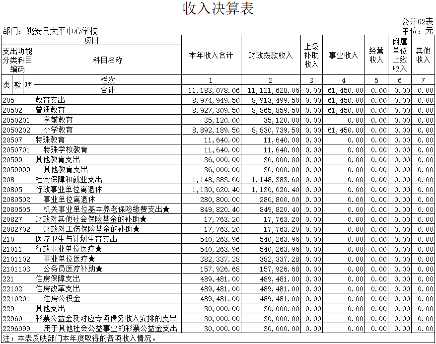 “收入决算表”中本单位总收入为11183078.06元,来自财政拨款收入11121628.06元,事业收入61450元,其他收入0元。