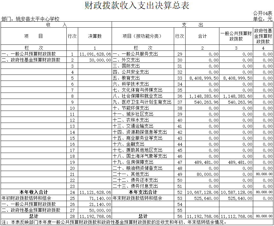 2017年一般公共预算财政拨款支出中,上年结转21140.00元,本年收入11091628.06元,本年年末结转和结余525640.00元。