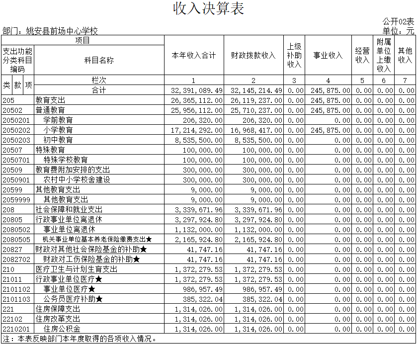 “收入决算表”中本单位总收入为32391089.49元,来自财政拨款收入32145214.49元,事业收入245875元,其他收入0元。