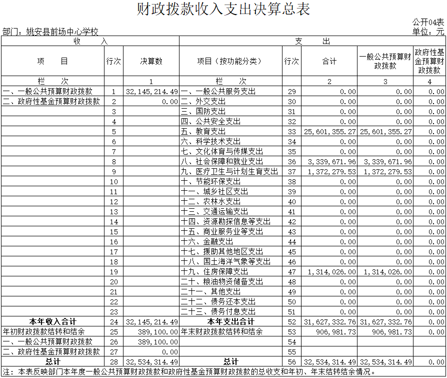 2017年一般公共预算财政拨款支出中,上年结转389100元,本年收入32145214.49元,本年年末结转和结余906981.73元。