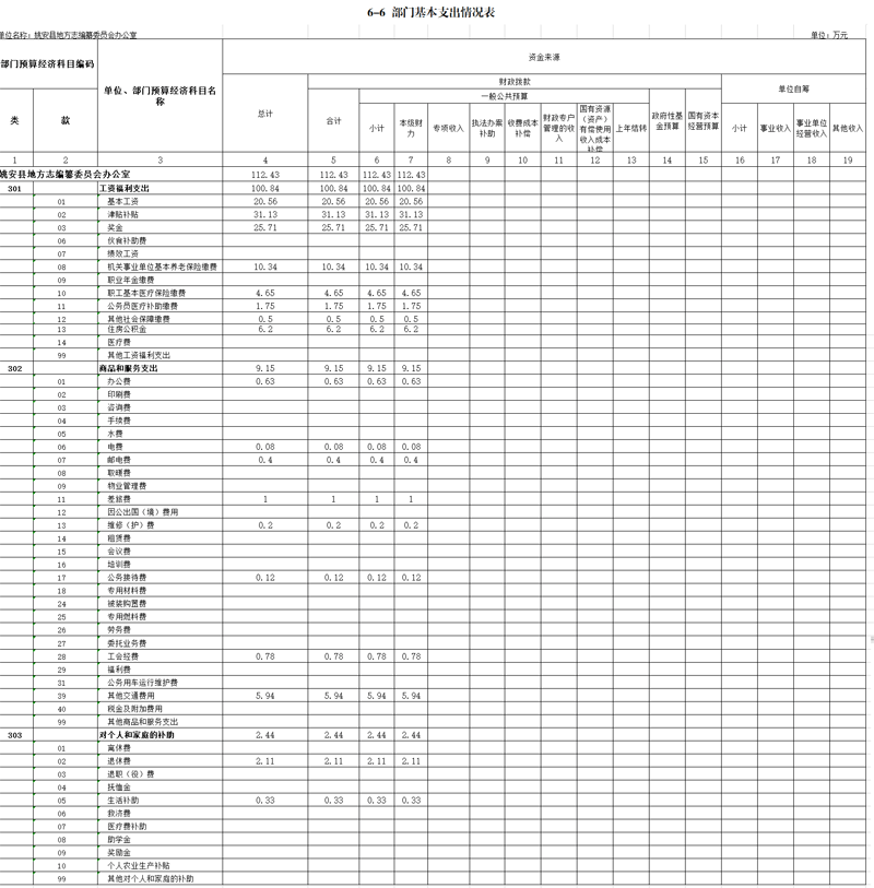 经济科目分组(其中:基本支出112.43万元,项目支出0万元)。其中列“301”工资福利支出100.84万元,包含在职职工工资、医保、社保等福利性支出;列“302”商品和服务支出9.15万元,包含办公费、电费、邮电费、差旅费、会议费、培训费、公务接待费等支出;列“303”对个人和家庭的补助支出2.11万元。