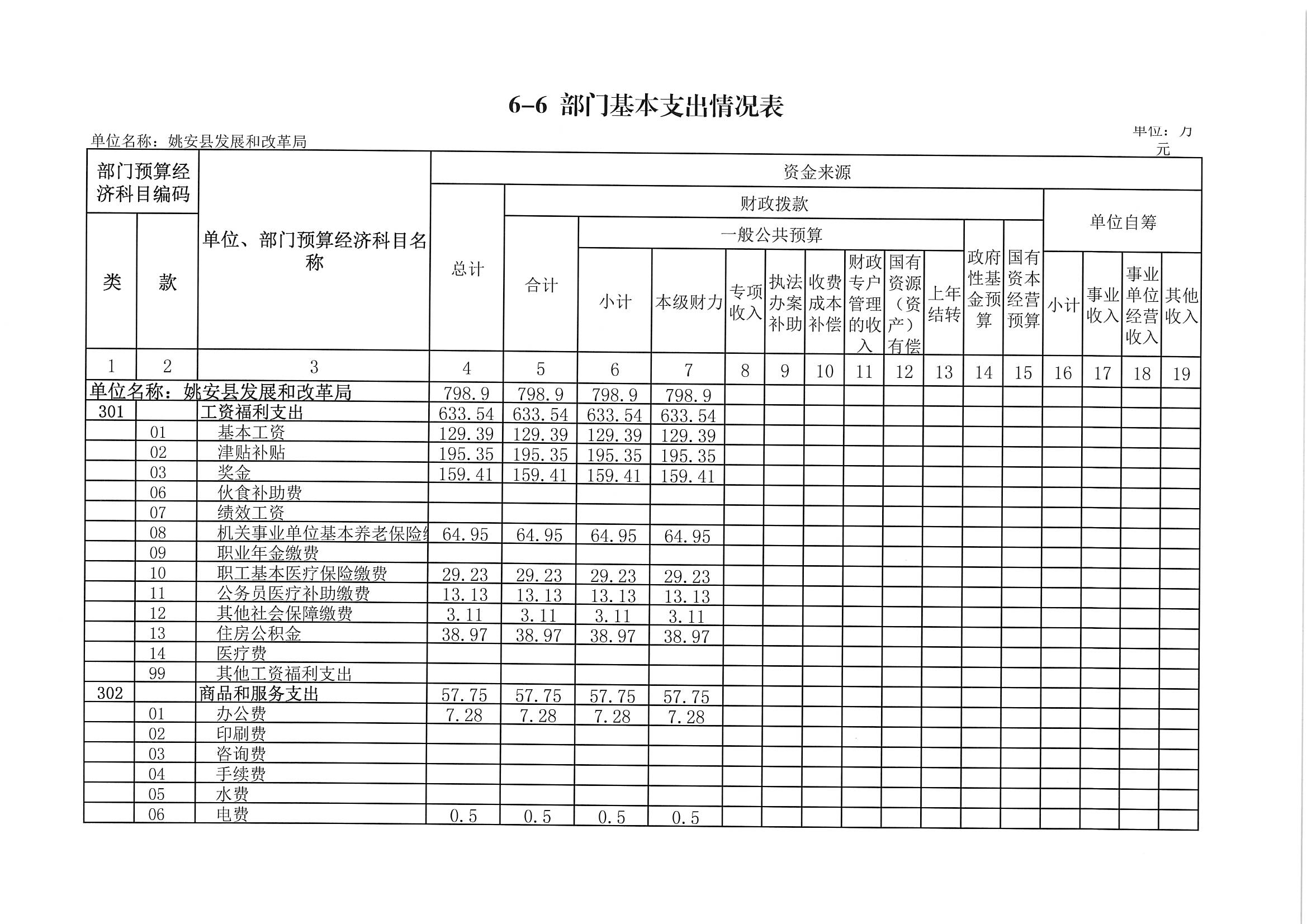 2019年原部门项目支出预算进行了分类整合,属于基本支出性质的工作经费纳入基本支出公用经费编制,重点项目预算另作安排,在安排下达项目预算资金时再进行绩效目标情况说明。2019年部门预算基本支出798.90万元,主要反映姚安县发展和改革局2019年保障机关事业单位工作正常开展方面的支出,做到保工资保运转。