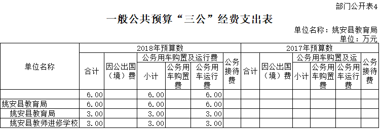 2018年县财政批复教育局保障本级及下属事业单位三公经费支出6万元,主要保障局机关、教师进修学校公务用车运行维护费用。
