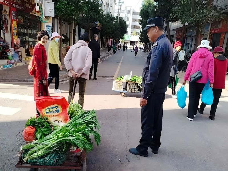 针对农贸市场早高峰时段人流、车流集中的特点,安排专人蹲点值守,保障通行秩序。在农贸市场内设置自产自销区域及临时摊贩区,同时,姚安花拍中心每日18:00-22:00开放临时摆摊区域,由执法人员引导商贩到划定特定区域摆摊经营。执法人员还耐心向商贩讲解占道经营的危害及疏导点优势,对有顾虑的商贩主动协助搬运设施、规划摊位,以“服务型执法”引导商贩主动配合,助力商贩树立规范经营意识。