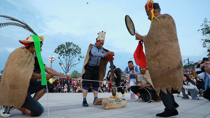 图为非遗进景区,游客与演员在光禄文昌宫载歌载舞