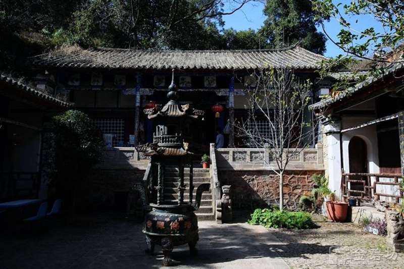 前殿又称过厅,面宽七间,进深四间,前后有廊,瓦顶为重檐,布瓦悬山式,上层为阁楼,阁楼前后开窗,建筑装修均为原样,保存较为完整,屋脊显著,殿前后均为四合院,殿内已无佛像。