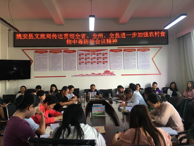 8月8日,姚安县文化和旅游局召开进一步加强农村食物中毒防控工作会议。会议传达贯彻了全省、全州、全县进一步加强农村食物中毒防控会议精神,总结回顾了2022年上半年文化和旅游系统食物中毒防控工作情况,分析研判了面临的形势,对2022年下半年食物中毒防控工作进行安排部署。