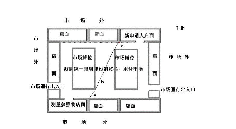 (3)各类综合性商品批发市场、专业市场、集贸市场内部 测量示意图。如下:新申请人与测量参照物间距=a+b+c。