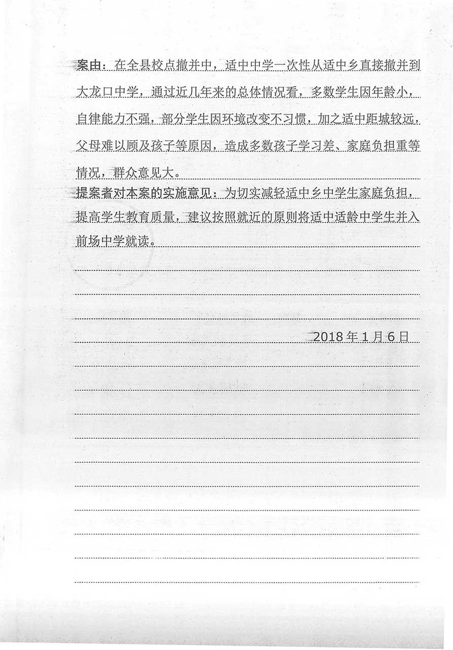 近年来,县委、县政府高度重视义务教育工作,在巩固提高义务教育成果、着力发展高中阶段教育的同时,着力推进义务教育均衡发展工作,全面改善学校办学条件和提高学校办学水平,县域义务教育学校发展较快。你们建议“将适中中学学生并入前场中学就读,建议就近就便原则调整到前场中学就读”的议案,确实反映了当地人民群众的一些愿望。但就当下的情况,将适中中学学生并入前场中学就读难度较大。一是校园窄,占地面积小,前场中学现有条件无法容纳比目前更多的学生,校园生均占地面积和校舍面积小,存在较大的实际困难。二是现在前场中学的办学条件只能满足现有办学规模需要,若要增容,还需新建教学楼、学生食堂、师生宿舍、运动场等,但就前场中学占地面积,无法扩容,困难和阻力都较大。三是大龙口中学现有办学条件较好,教学楼、食堂、宿舍、运动场、图书室、实验室等设施等均能满足现有学生的办学规模需要,教育部门也将继续加强学校的内部管理,提升办学水平,提高办学质量,积极配合公安、运政、交警等部门服务好学生,确保学校学生安全,让学生安心在学校享受更好的教育资源。