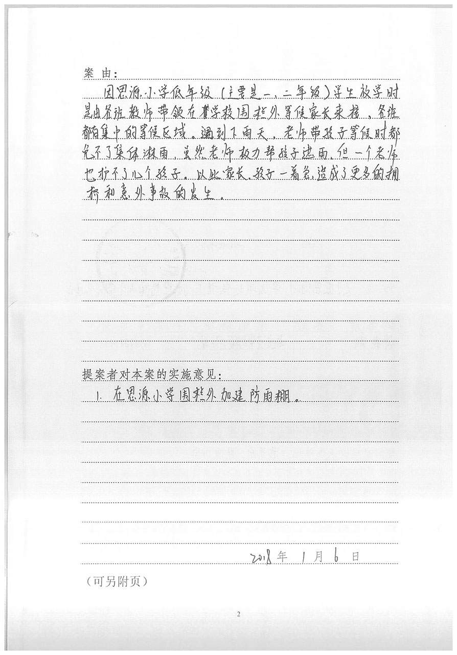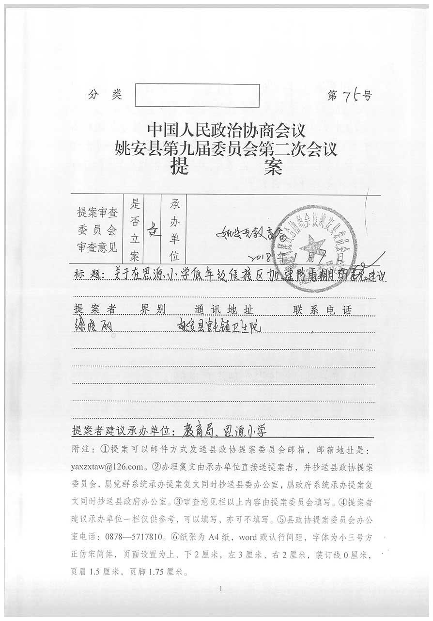 您在政协姚安县九届二次会议期间提出的“关于在思源实验学校低年级候接区加建雨棚”的提案(第75号)已交我局研究办理。在此,对您关心姚安教育之心表示感谢,并将您的建议案落实情况回复如下: