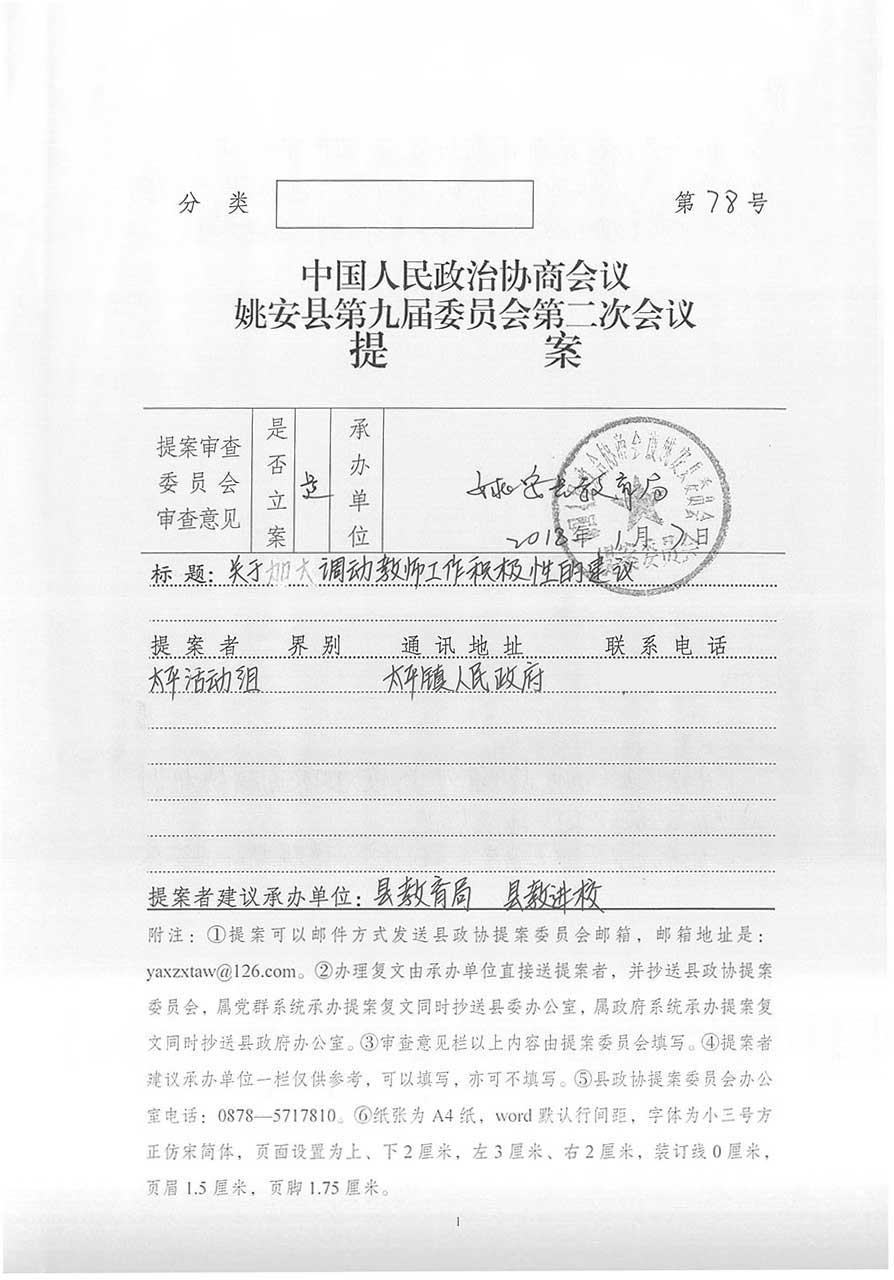 你们所提的“关于加大调动教师工作积极性的建议”提案(第78号)已交我局研究办理。在此,对你们关心姚安教育之心表示感谢,并将你们的建议案落实情况回复如下: