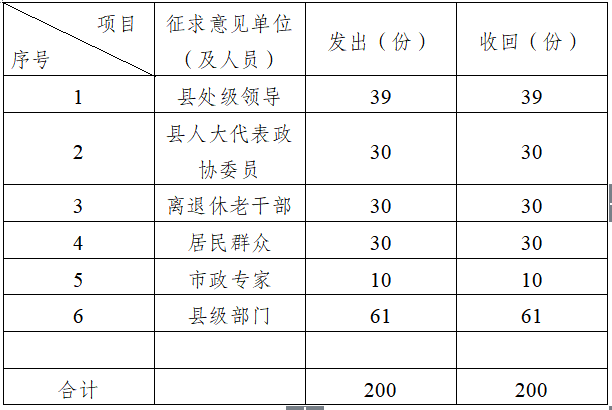 为选择适宜我县特色的绿化树木品种开展道路绿化,充分展示县城地域特点和人文特色,改善县城绿化水平、打造森林城市、提升县城品位。县住建局结合我县行道树种植历史、气候环境等因素,于2018年3月20日拟定了《关于征求姚安县城区道路绿化树木品种意见的函》,分别印送到各县处级领导、县级各部门、部分县人大代表、县政协委员、市政专家、居民代表、离退休老干部开展意见征求,共发出《姚安县城区道路绿化树木品种推荐名录》200份。截至2018年4月10日共收回征求意见表200份,征求意见情况为: