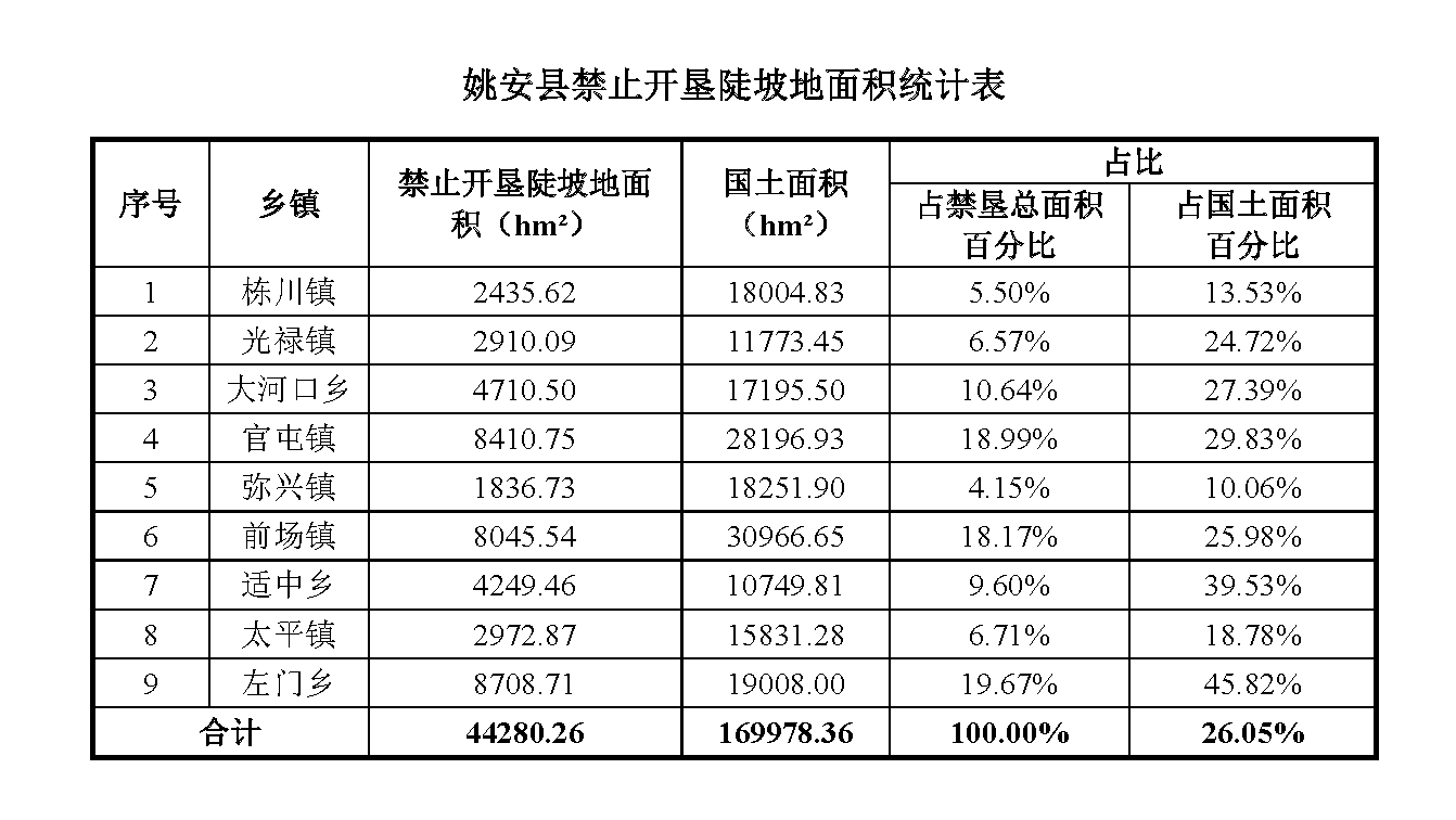 一、依据《云南省禁止开垦陡坡地范围划定工作技术方案》,姚安县共划定禁止开垦陡坡地面积44280.26公顷、图斑数1316个,涉及姚安县9个乡镇74个村(居)委会。