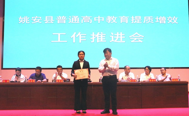 2022年7月12日,姚安县委、县人民政府在姚安一中报告厅召开普通高中教育提质增效工作推进会。县委副书记、县长林帮荣,县政协主席周晓东,县委常委、县人民政府常务副县长吴学剑,县委常委、县人民政府副县长张宏勇,县人大常委会副主任杨海虹、县人民政府副县长马丽、县政协副主席潘建勋,楚雄州教育体育科学研究所所长自洪明、副所长杨修昌出席了推进会;部分县级部门主要领导,县教育体育局领导班子成员、股室负责人,县属学校校(园)长、书记、姚安一中全体教职工,祥云祥华中学派驻姚安一中管理团队参加了推进会。推进会上县人民政府副县长马丽宣读了姚安一中党总支书记、姚安一中校长的任免决定,县委副书记、县长林帮荣为新聘任的姚安一中校长高艳艳颁发了聘书,姚安一中党总支书记刘建忠、校长高艳艳分别做了表态发言,楚雄州教育体育科学研究所所长自洪明做了指导讲话。