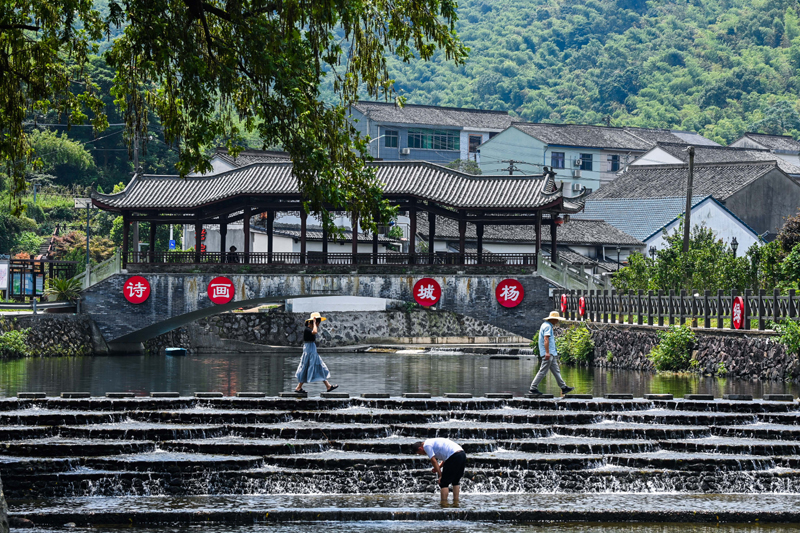 2023年8月10日,游客在浙江省宁波市鄞州区城杨村的溪流玩耍。新华社记者 徐昱 摄