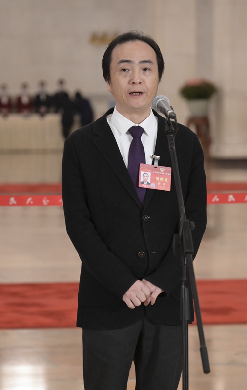 3月7日,舒勇委员在全国政协十四届二次会议第二场“委员通道”集体采访活动上接受媒体采访。新华社记者 李贺 摄