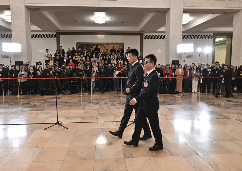 3月8日,在十四届全国人大二次会议第二场“代表通道”上,王永澄代表(前右)在工作人员的协助下前行,准备回答记者提问。新华社记者 才扬 摄