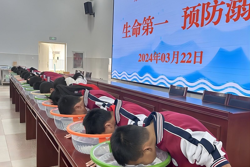 活动中,为了让学生的安全意识入心入脑,组织学生进行“小脸盆,大安全”防溺水体验式活动。