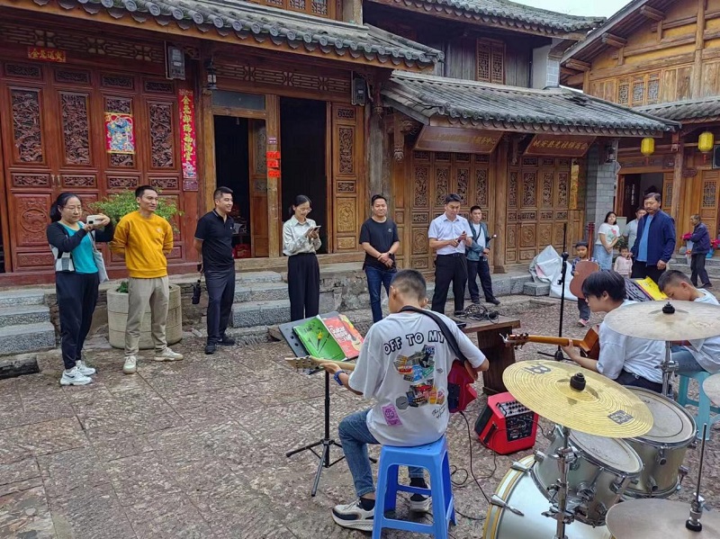 上午,古筝、架子鼓、吉他、葫芦丝、电钢琴、左脚舞表演散布在光禄古镇各热闹景点,浓厚的音乐氛围充满古镇的每个角落。