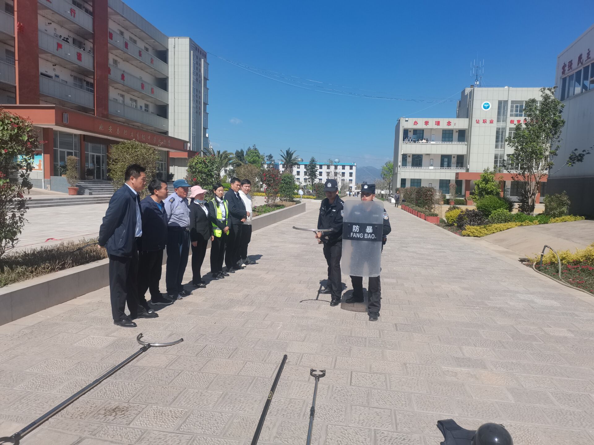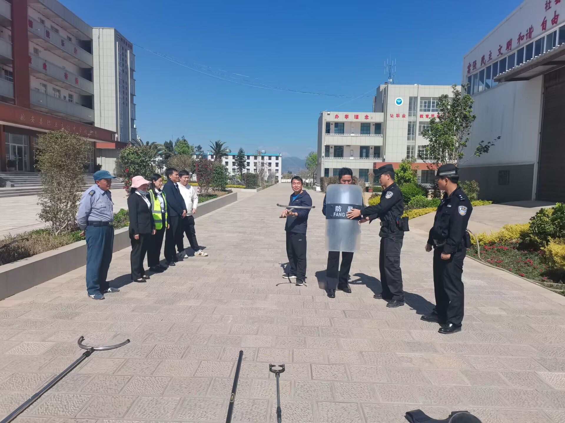 派出所民警官详细介绍了防暴衣服、盾牌、防暴警棍、防暴钢叉等工具的使用方法,组织学校班子成员、安保人员、宿舍管理员、值周护校教师等进行防范、多人合围和盾、棍、叉联动等实战练习。